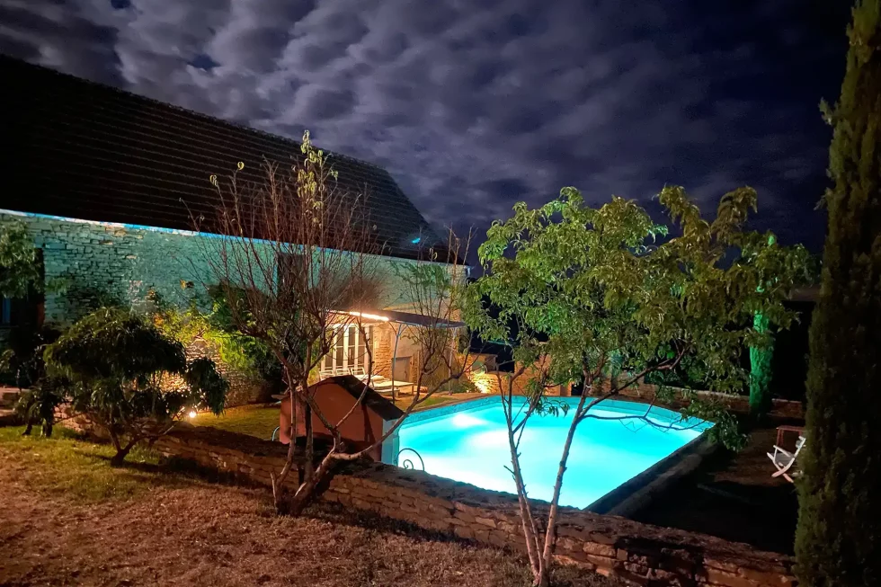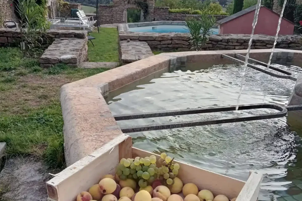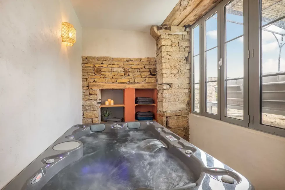 Relax in this splendid setting with a large communal outdoor pool, a private Spa area (sauna and jacuzzi), and many furnished terraces, all while enjoying the stunning views of the hills and vineyards of the Clunisois.
